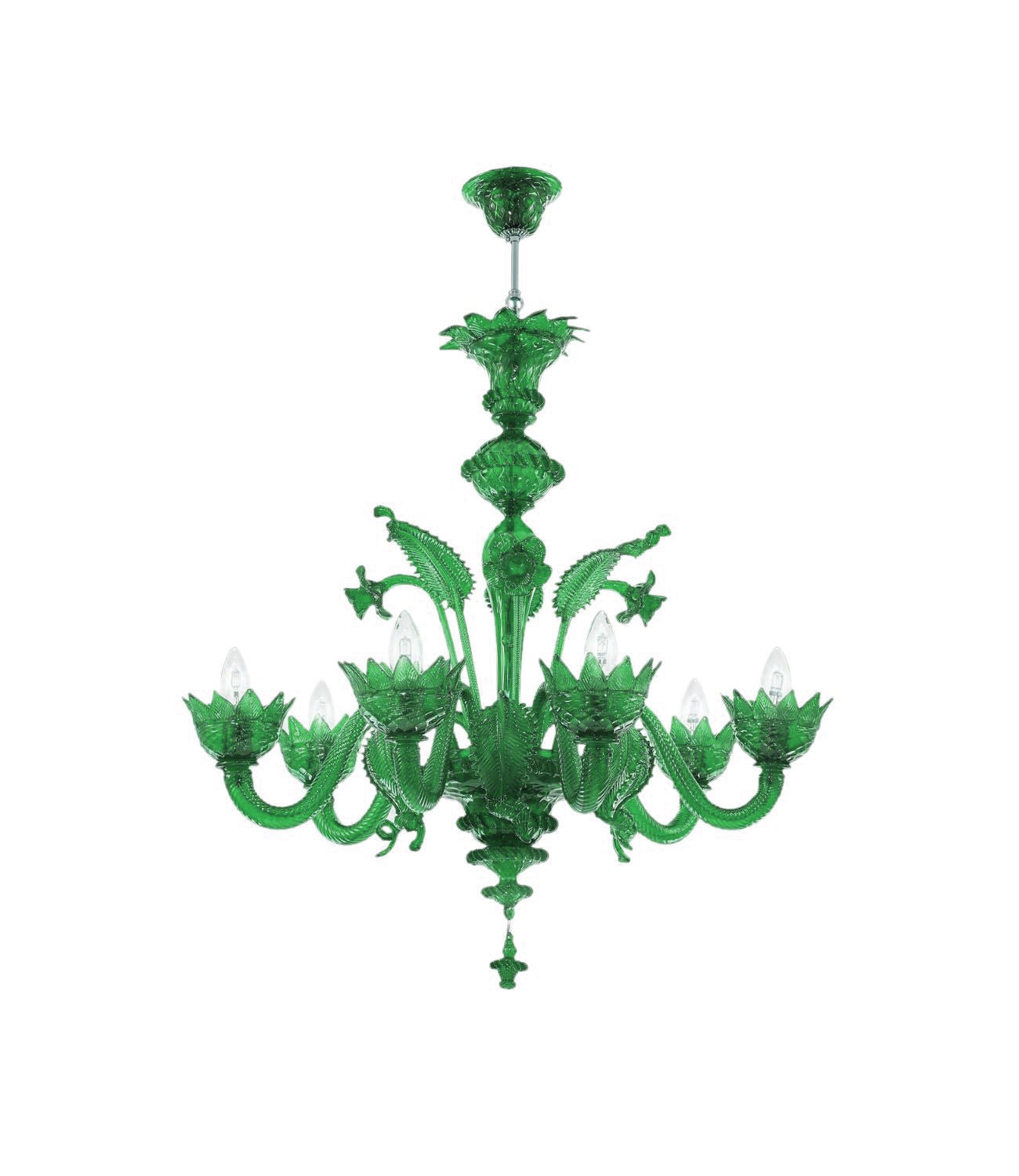 Das charakteristische „Rigata Ritorta“ (gedrehte Rippen) ist ein Detail, das von den Glasmachermeistern Muranos ohne Verwendung von Formen gefertigt wird. Die mit Blumen und Blättern verzierten Dekorationen sind ebenfalls sorgfältig handgefertigt.