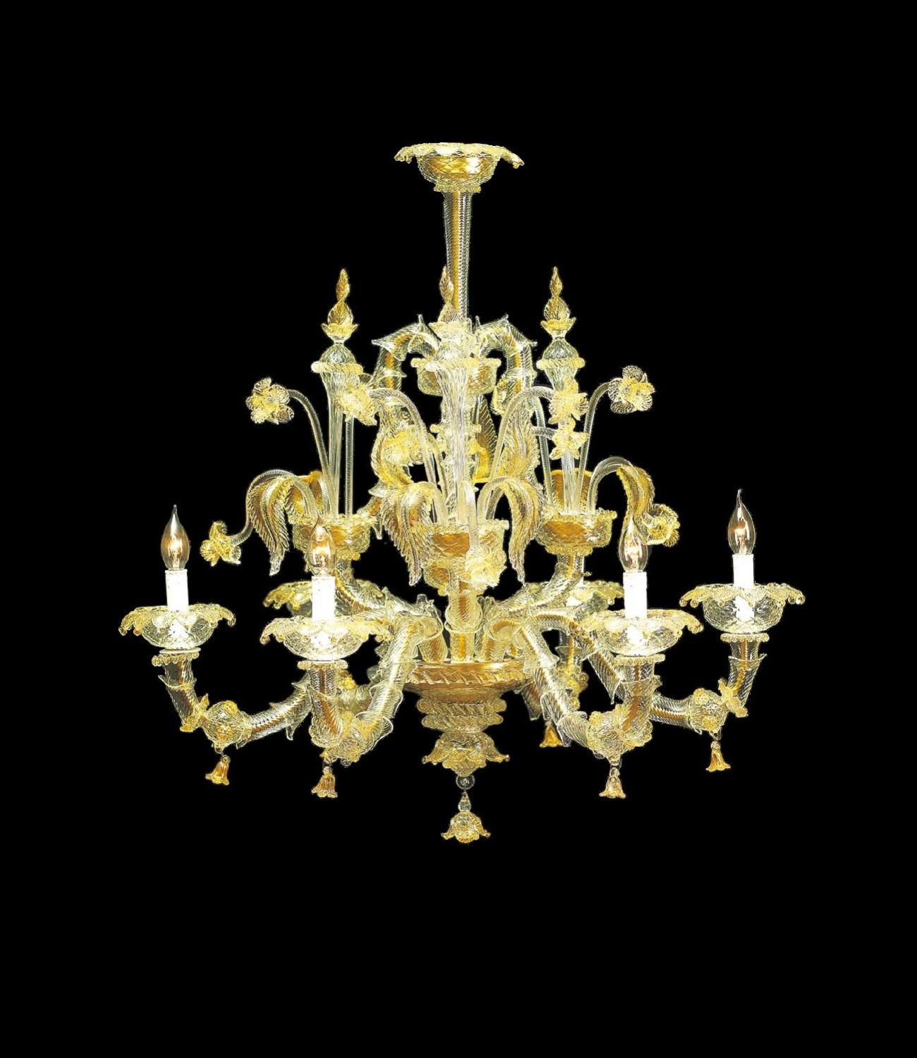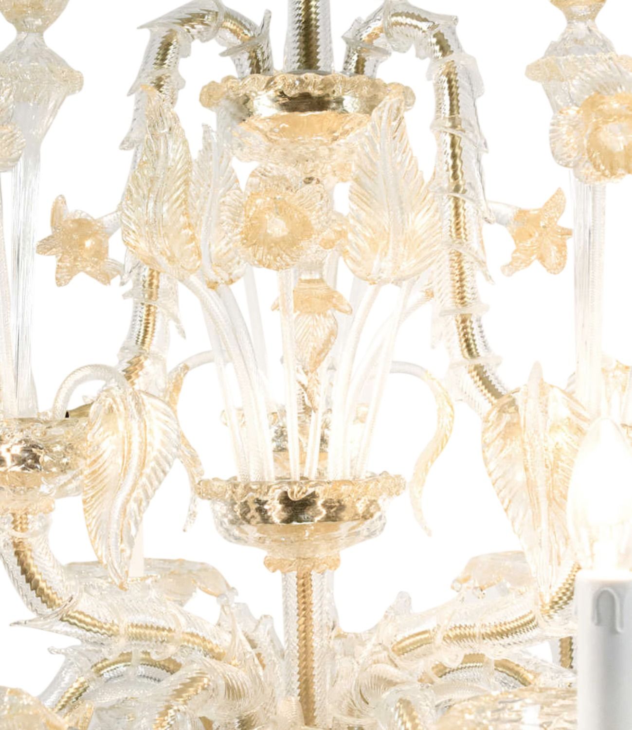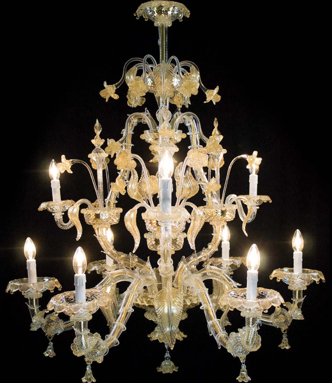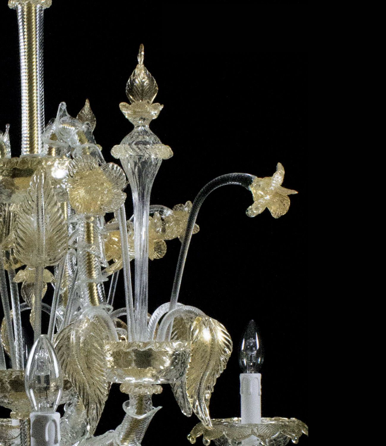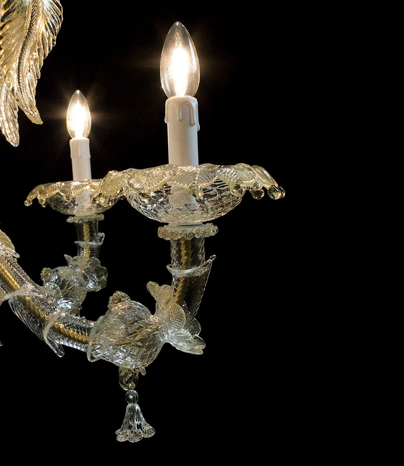 Structured on 3 stages with 6 lights on the first, 3 on the second and 3 on the third. In this very elegant chandelier the details dominate, the “bossole”, the flowers, the leaves and the bells. The environments that are most suited to this type of Venetian chandelier are large spaces with ceilings from which it descends and remains suspended, enhancing all its majesty.