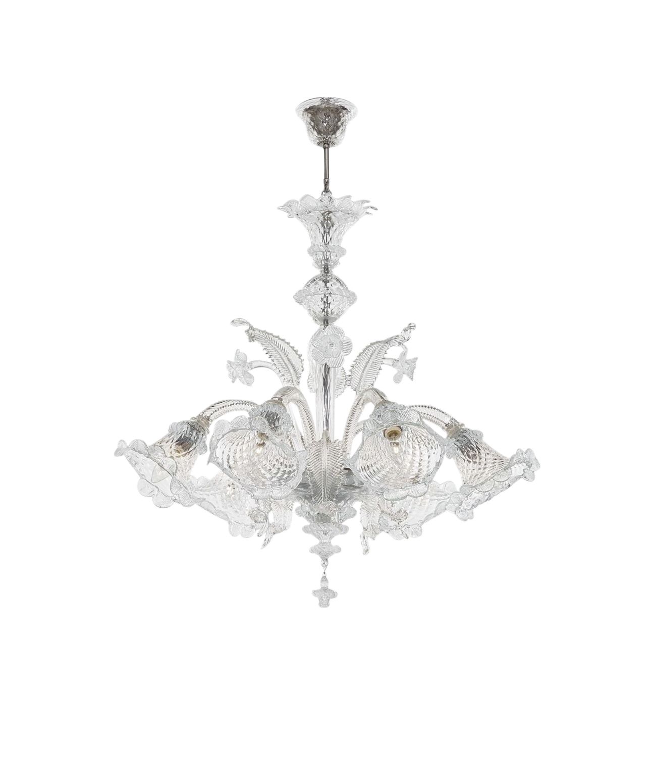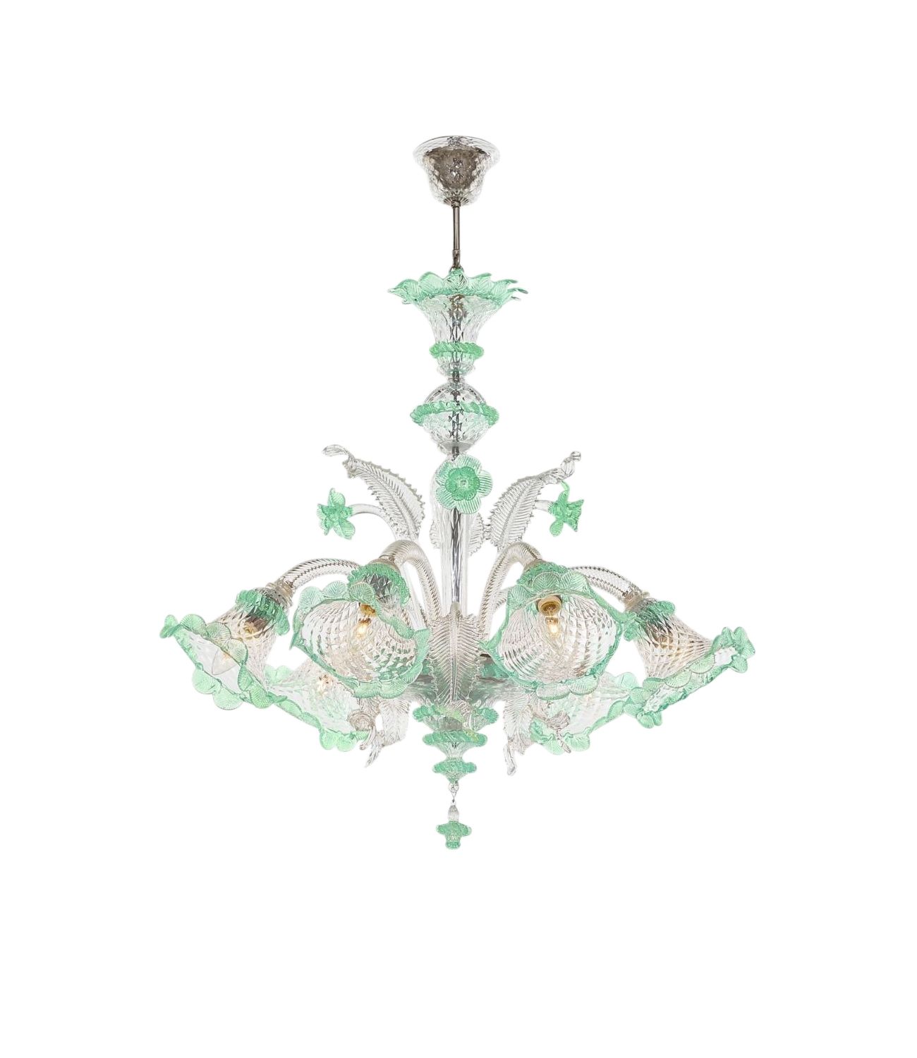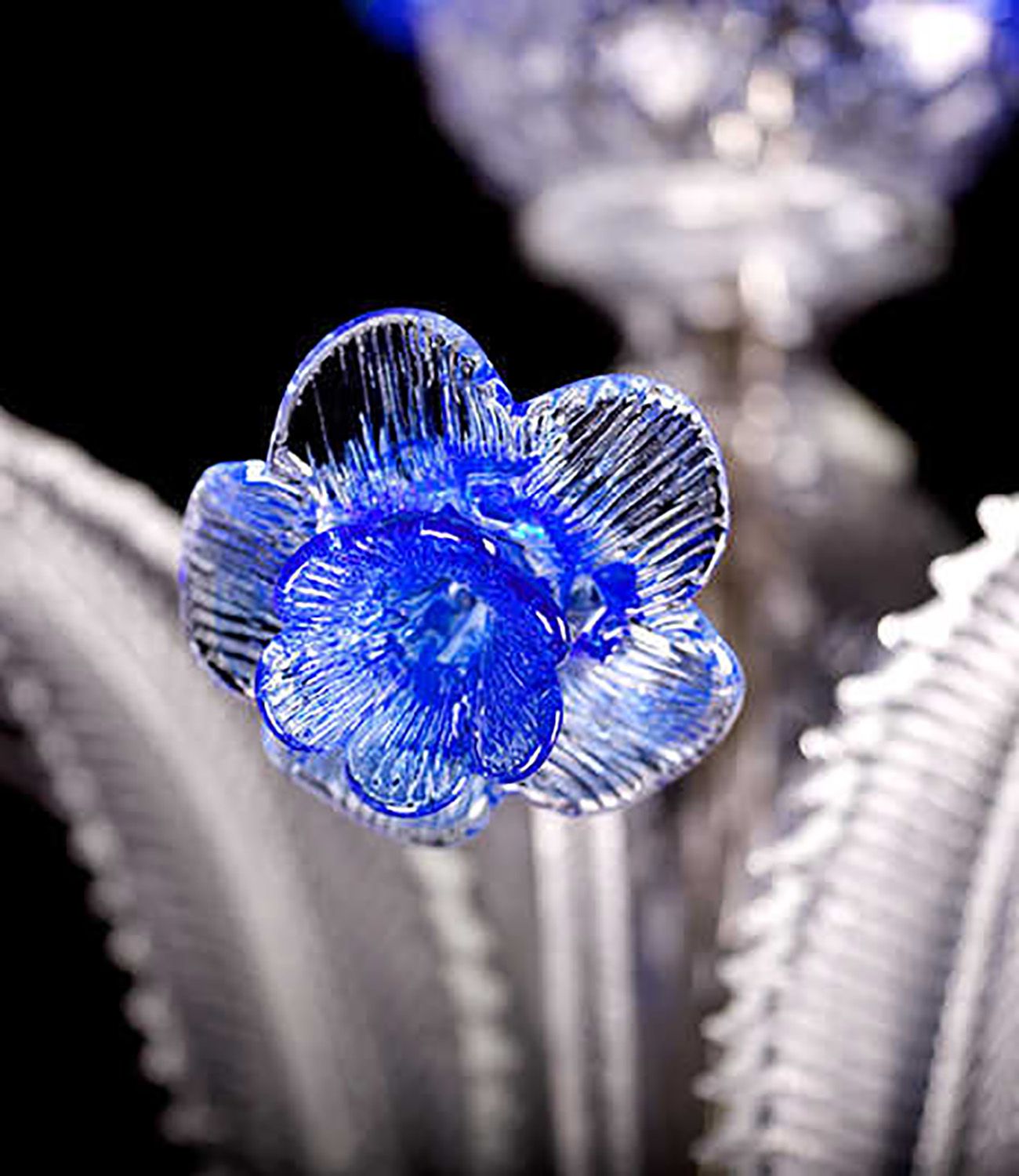 Caractérisé par le détail “Rigata Ritorta” réalisé par les maîtres verriers muranais sans usage de moules. Embelli par des fleurs et des feuilles, également ces décorations travaillées rigoureusement à la main.