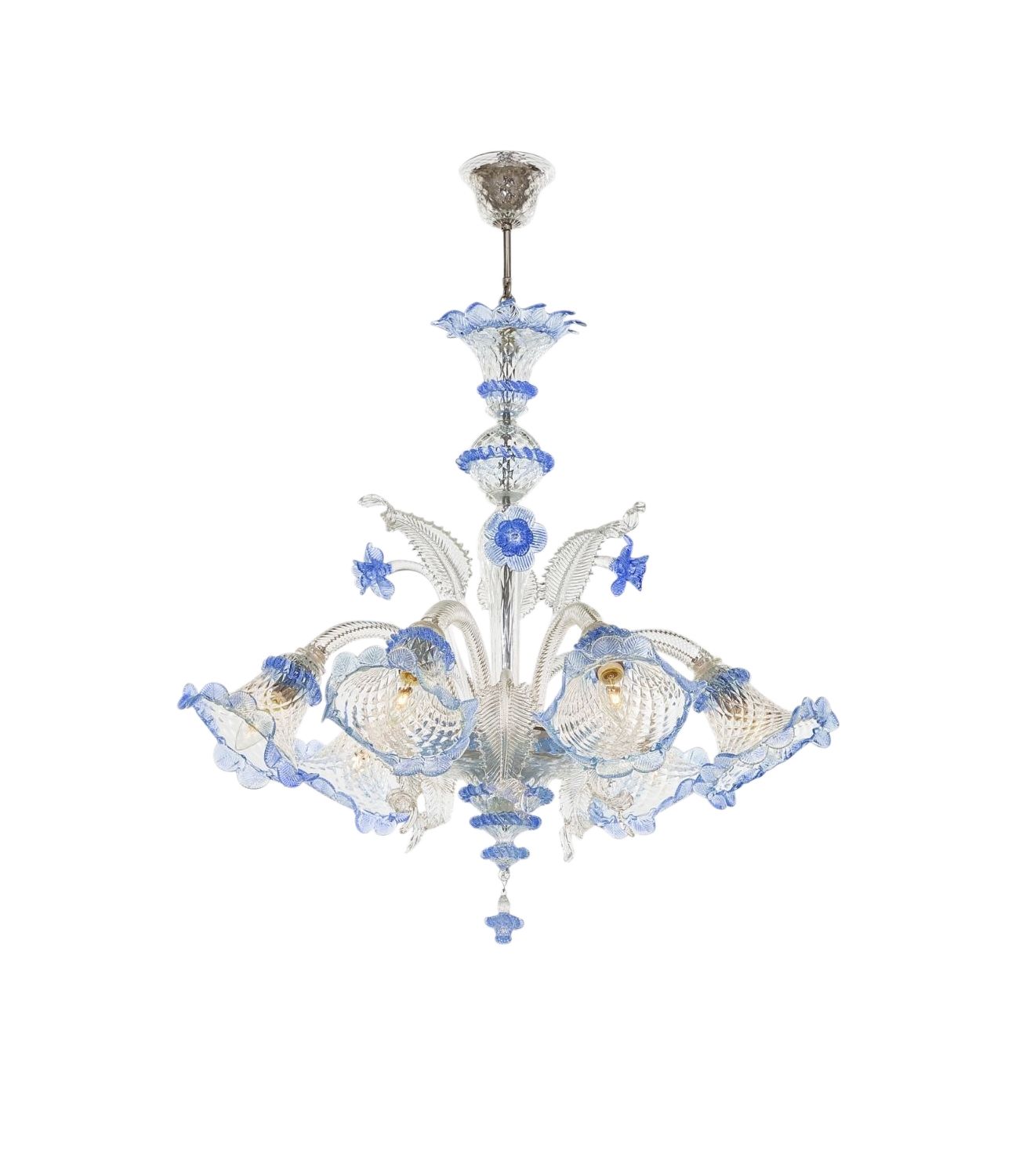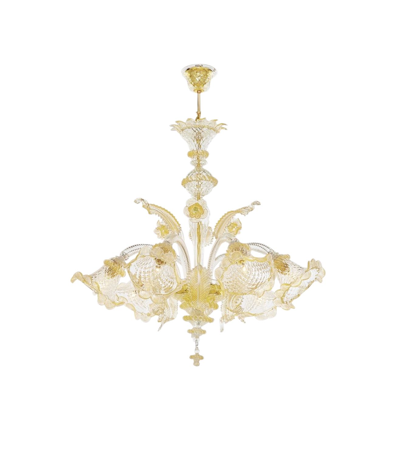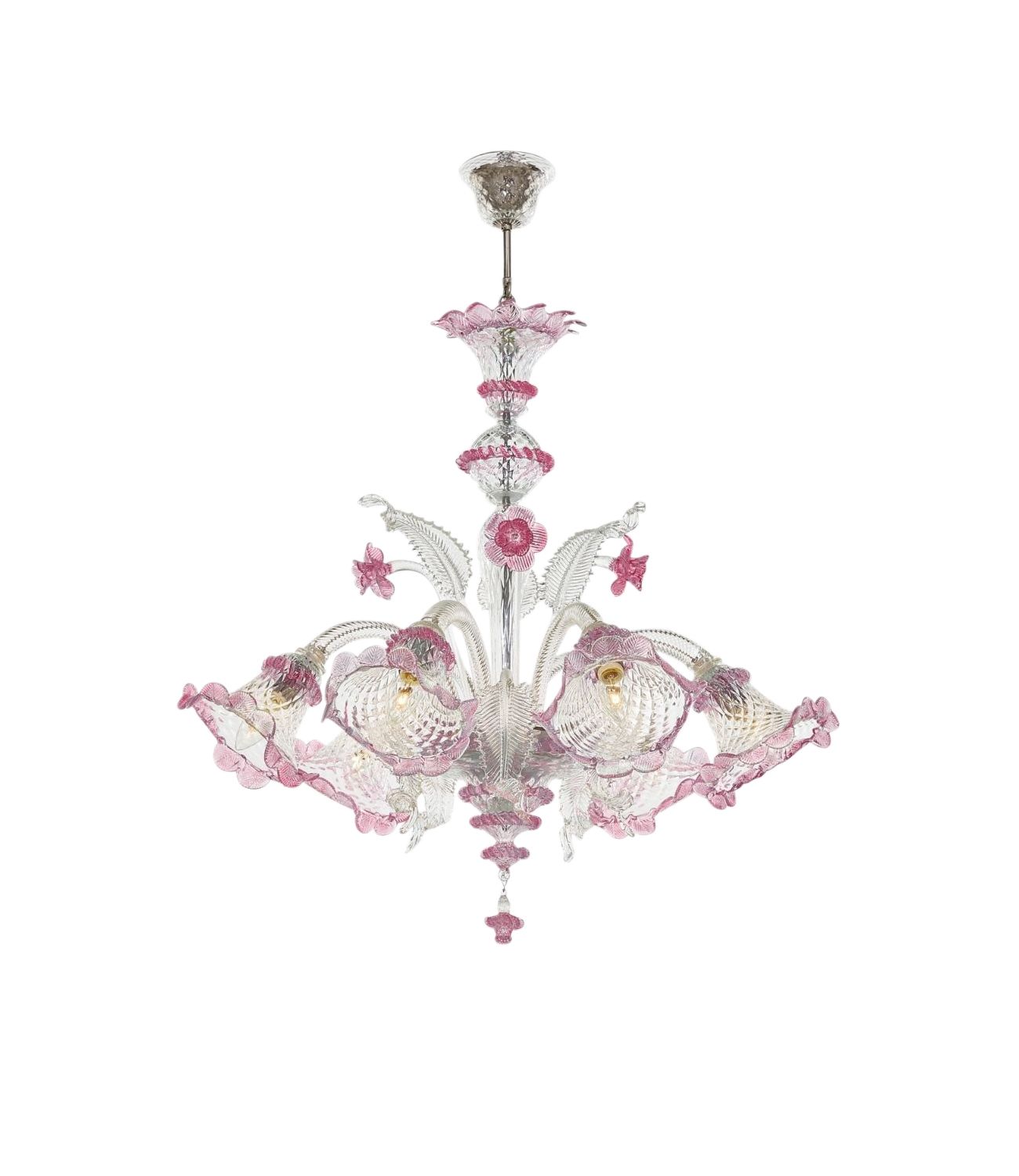 Caractérisé par le détail “Rigata Ritorta” réalisé par les maîtres verriers muranais sans usage de moules. Embelli par des fleurs et des feuilles, également ces décorations travaillées rigoureusement à la main.