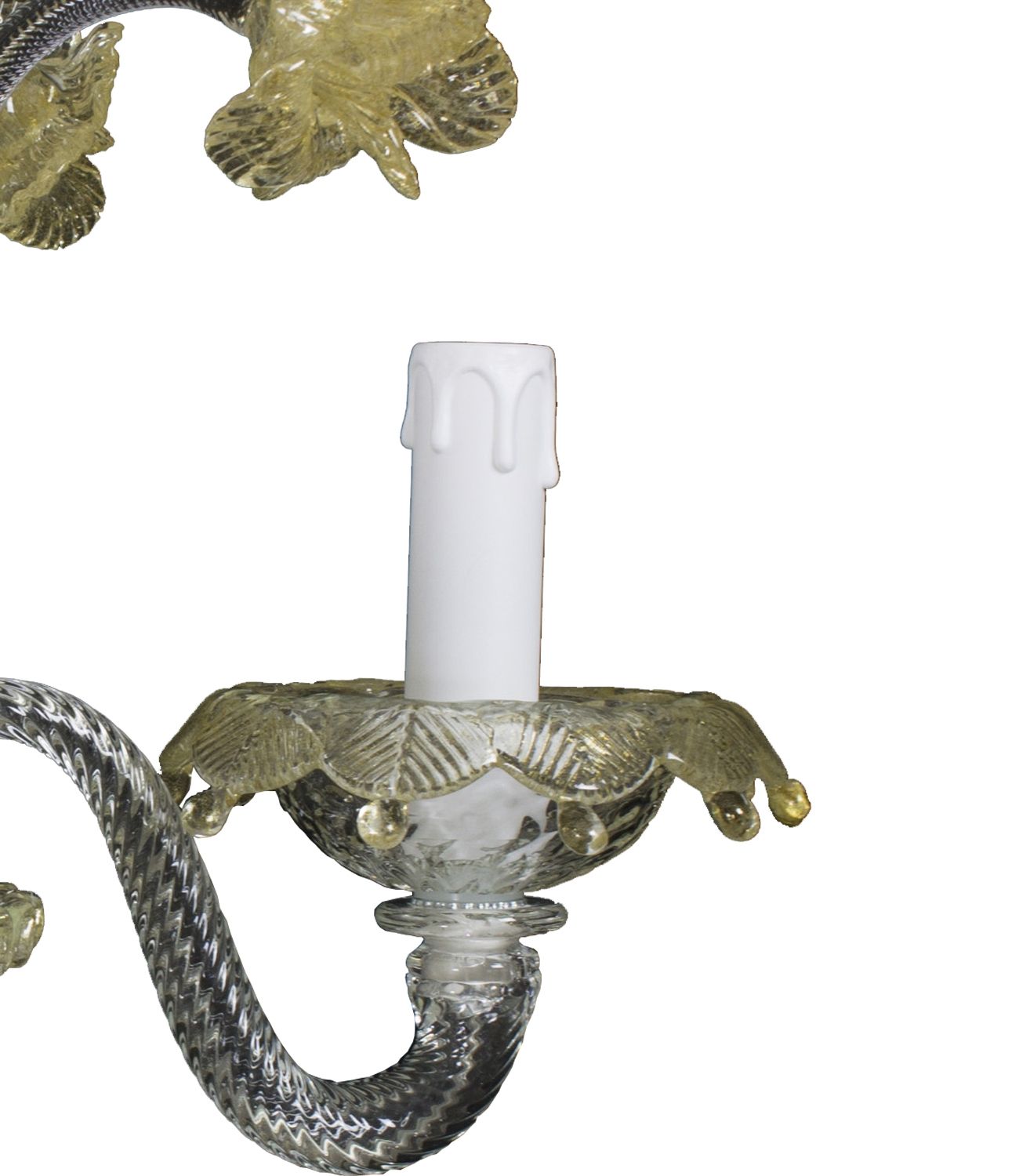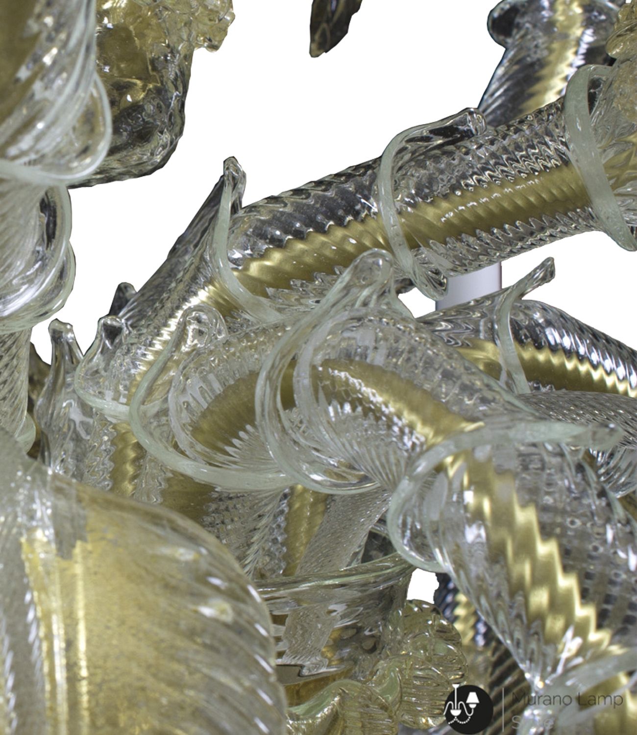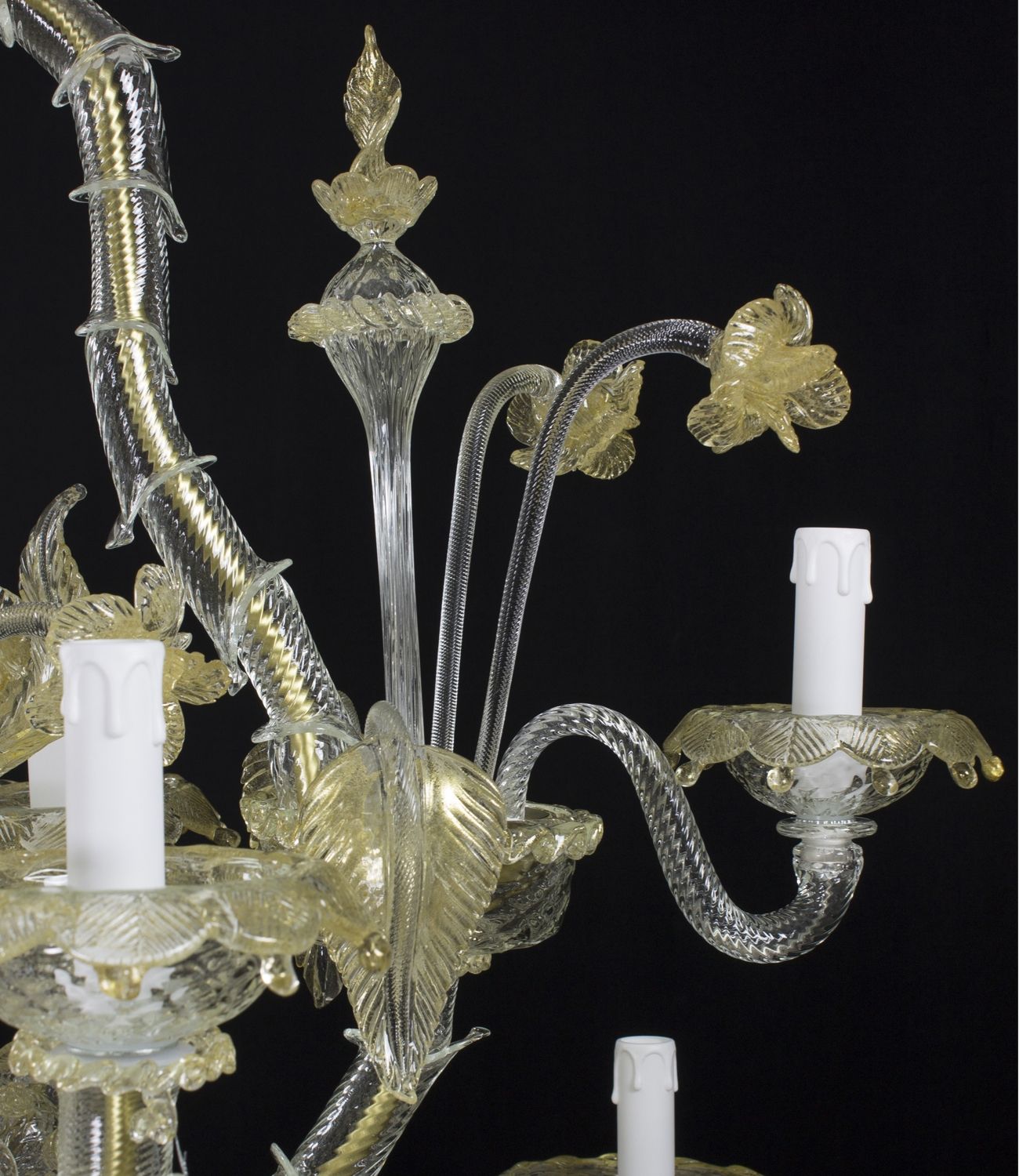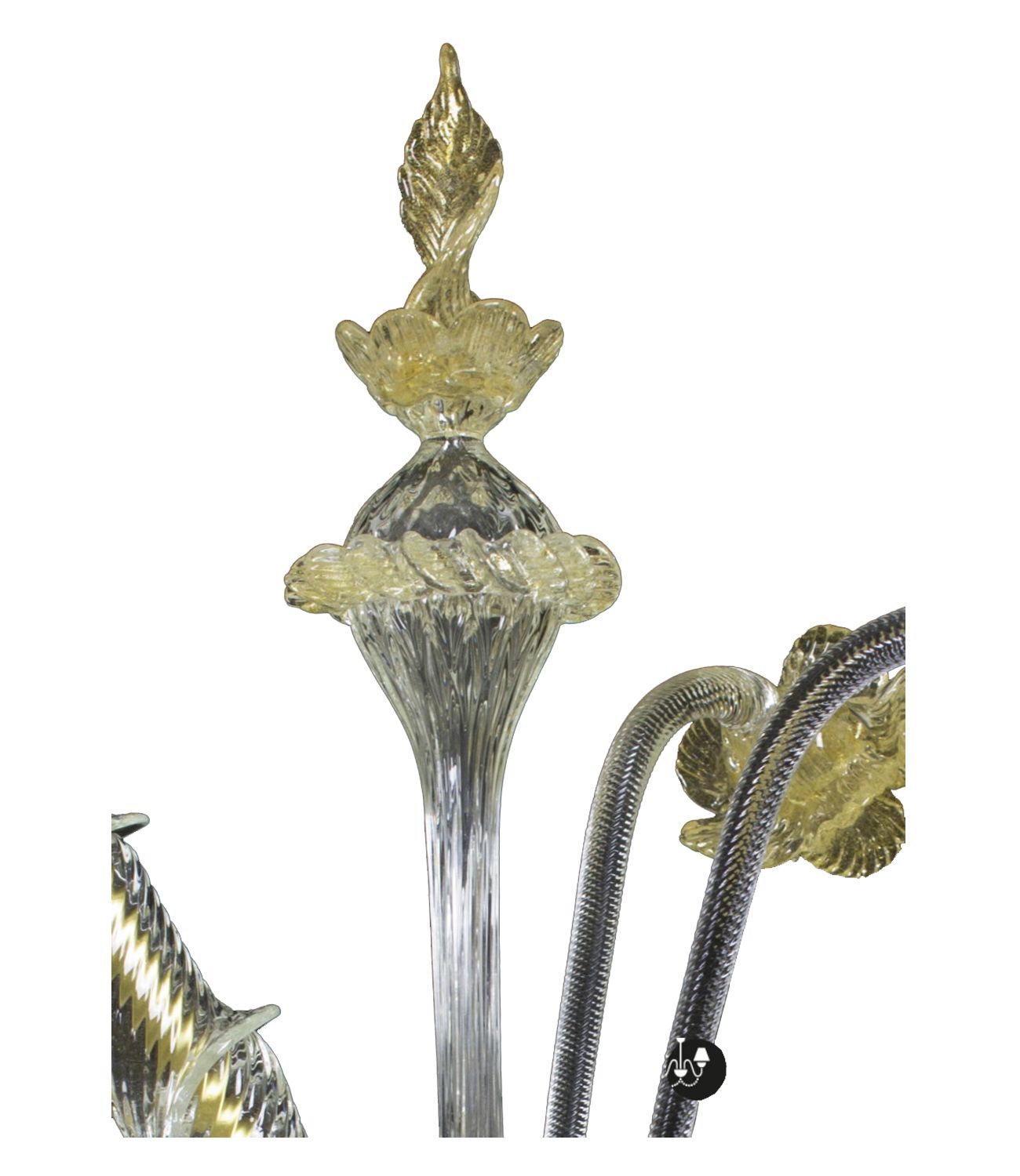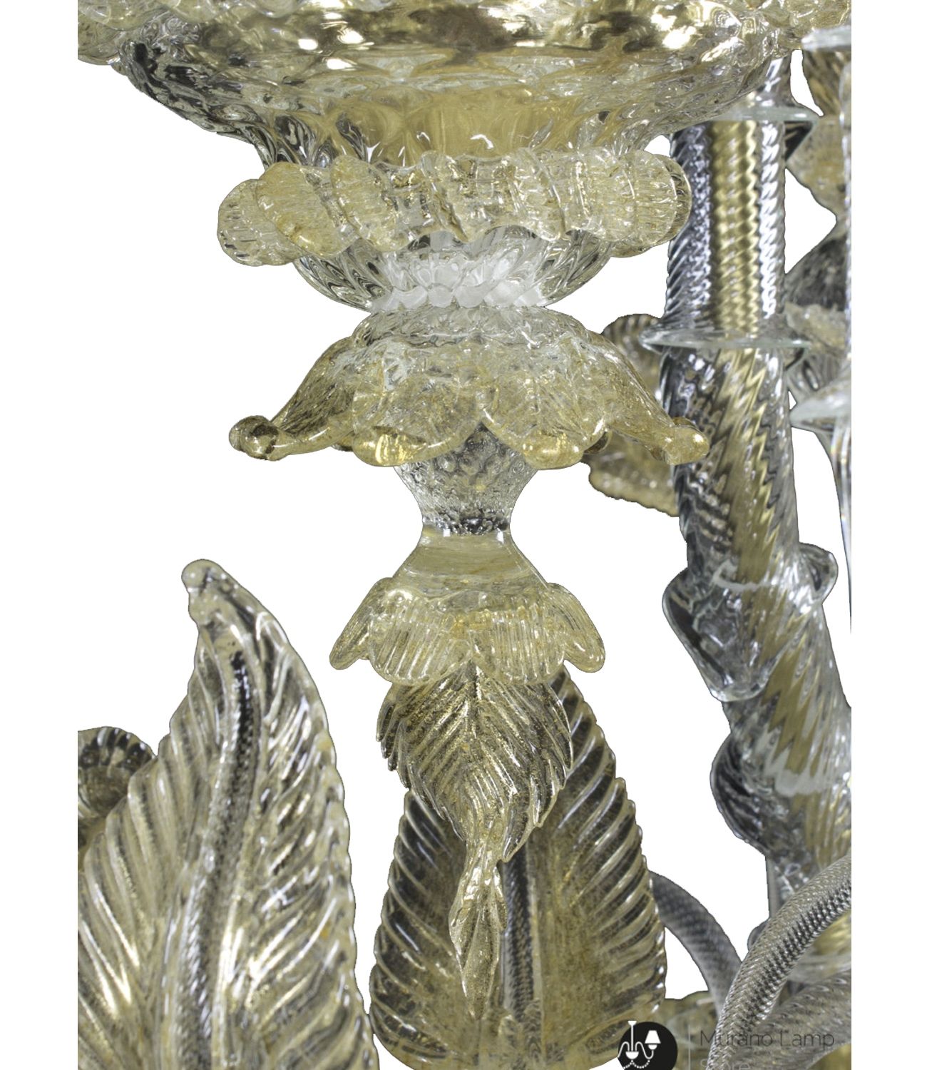 Caratterizzato dalla lavorazione “Rigata Ritorta” dettaglio realizzato dai Maestri vetrai muranesi senza uso di stampi. Impreziosito da fiori e foglie, anche queste decorazioni lavorate rigorosamente a mano.