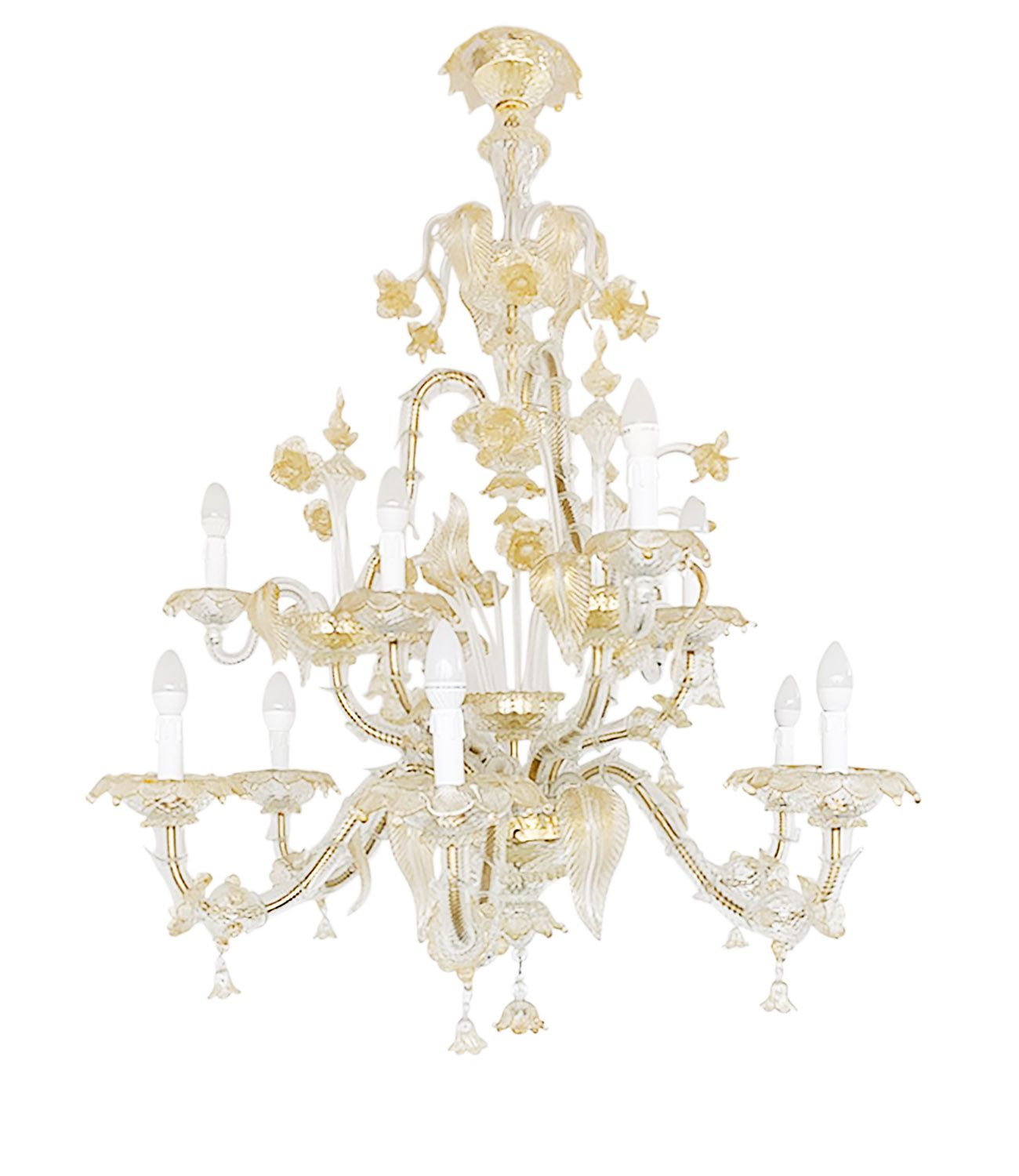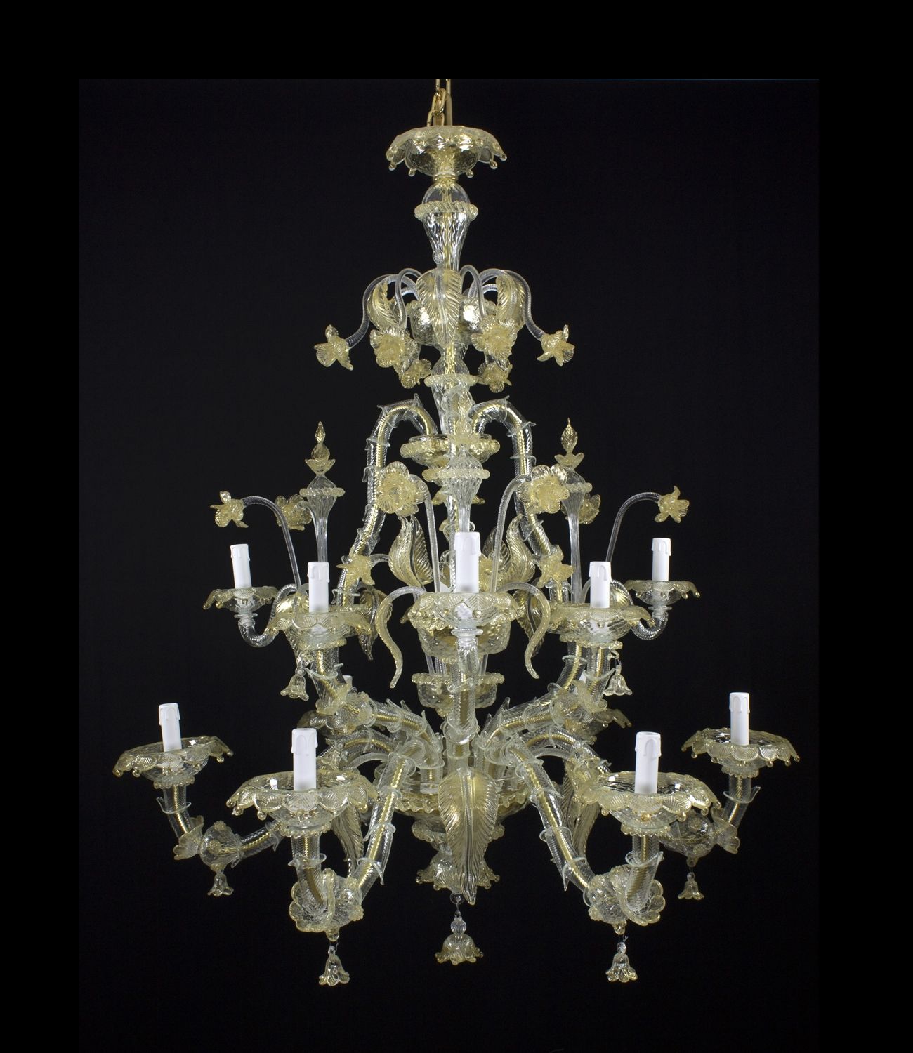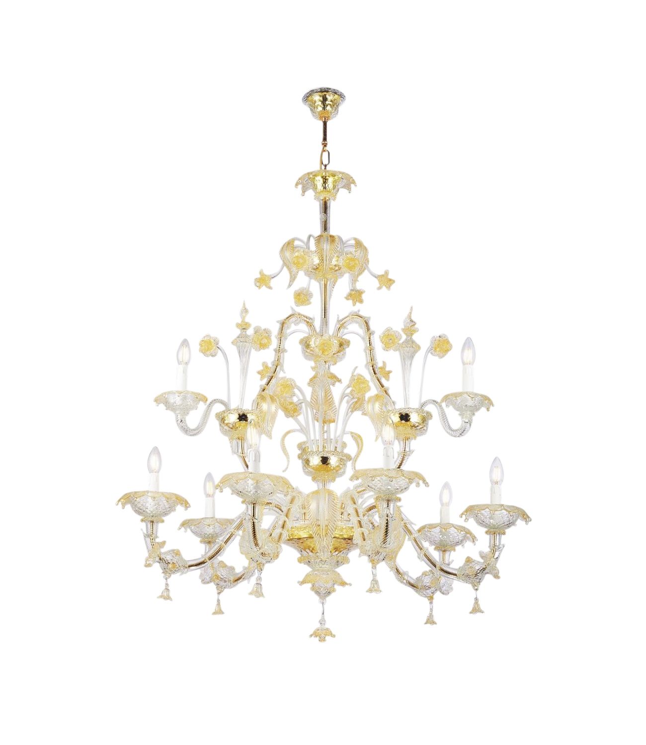 Il lampadario ca rezzonico murano fondaco è strutturato su 3 palchi dotati rispettivamente di 6 luci il primo, 3 il secondo e altre 3 il terzo. In questo elegantissimo lampadario murano rezzonico fanno da padrone i dettagli, le “bossole”, i fiori, le foglie e le campanelle. Gli ambienti che più si addicono a questa tipologia di lampadario veneziano sono ampi spazi con soffitti dai quali scende e rimane sospeso esaltando tutta la sua maestosità.