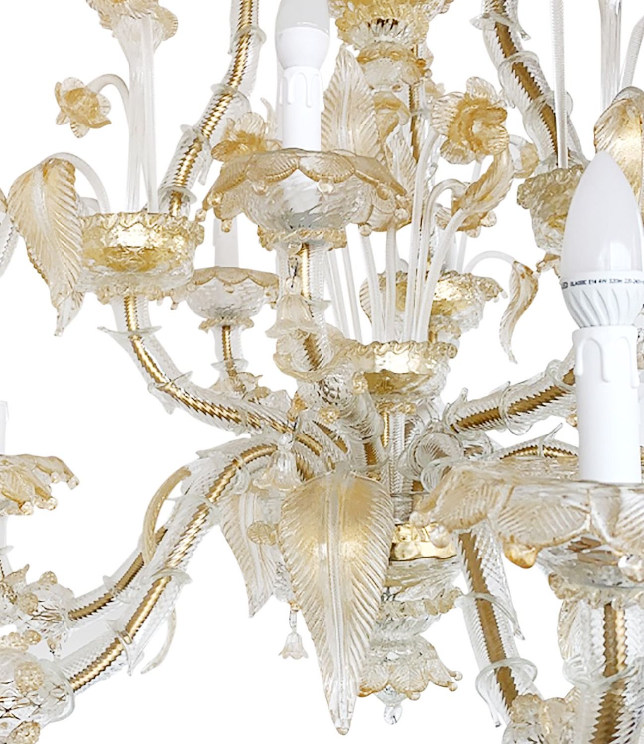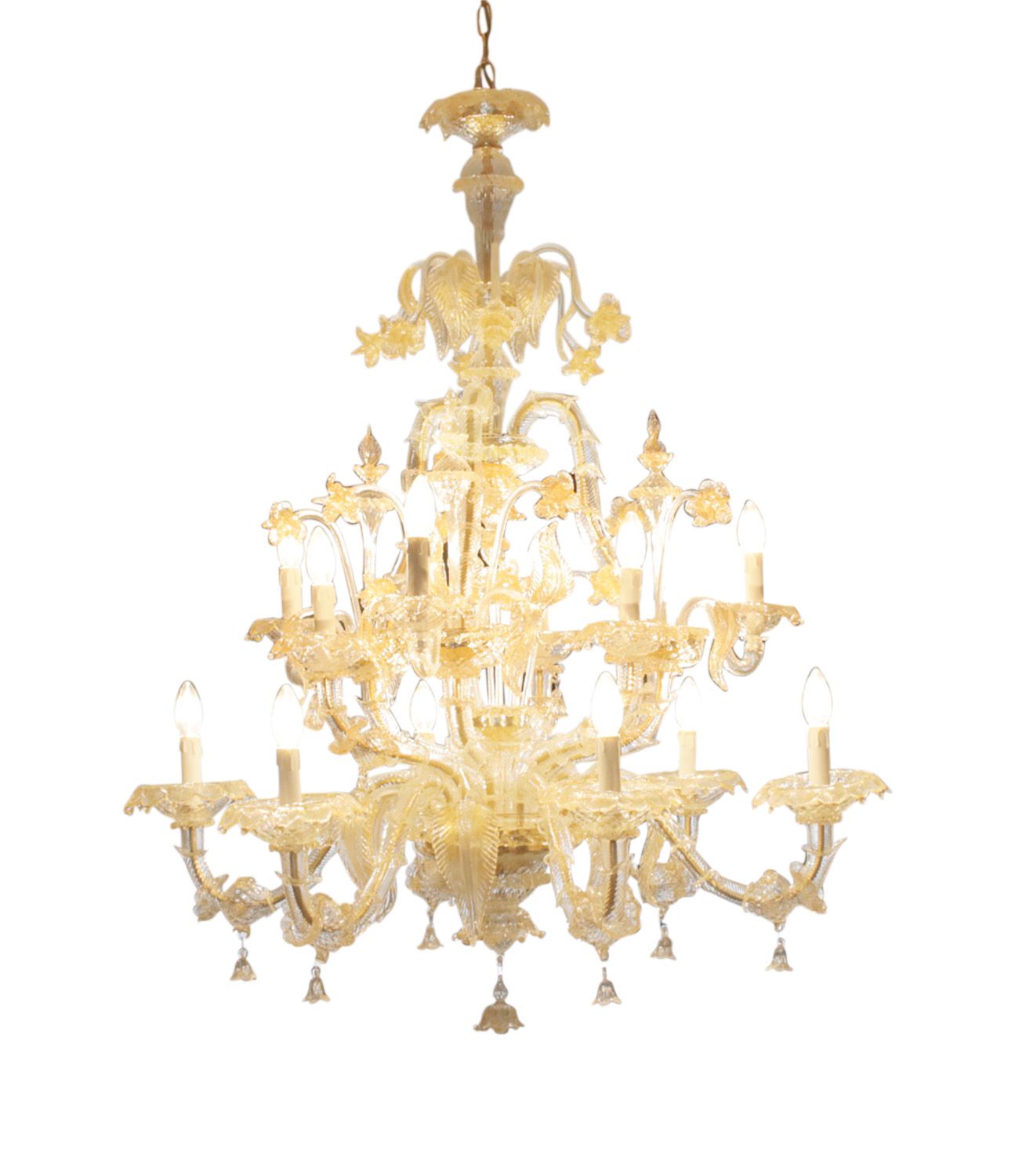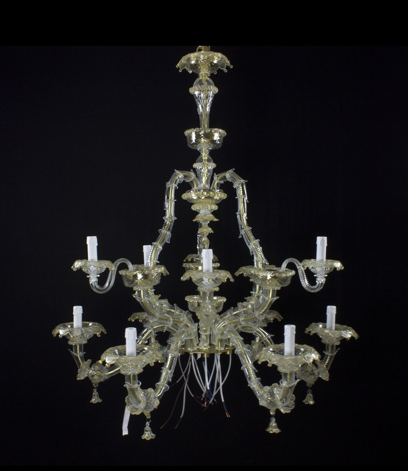 Il lampadario ca rezzonico murano fondaco è strutturato su 3 palchi dotati rispettivamente di 6 luci il primo, 3 il secondo e altre 3 il terzo. In questo elegantissimo lampadario murano rezzonico fanno da padrone i dettagli, le “bossole”, i fiori, le foglie e le campanelle. Gli ambienti che più si addicono a questa tipologia di lampadario veneziano sono ampi spazi con soffitti dai quali scende e rimane sospeso esaltando tutta la sua maestosità.