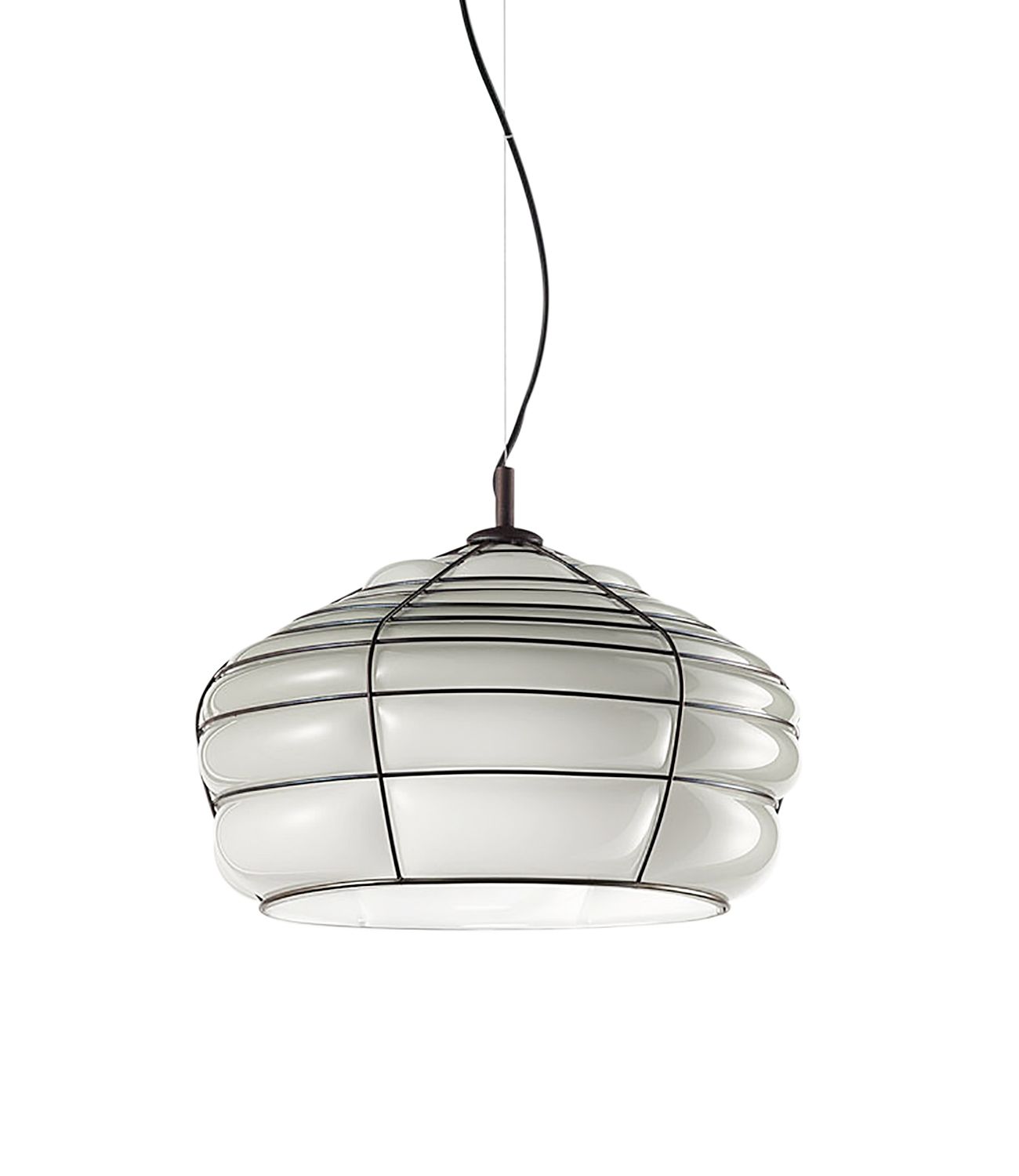 Caratterizzato dalla "Gabbia di metallo" dove al suo interno il vetro prende forma. Lavorazione dettagliata e minuziosa realizzata dai Maestri vetrai muranesi senza uso di stampi. Impreziosito da forme e linee di design che elegantemente poi creano gli effetti di luce particolari e unici.