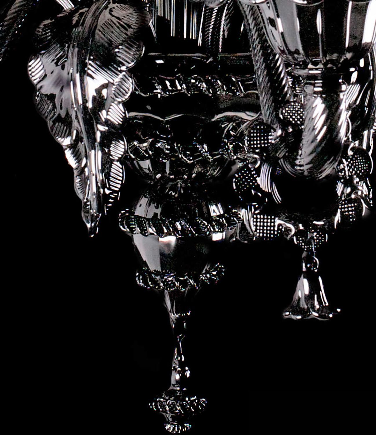 Caratterizzato dalla “Rigata Ritorta” dettaglio realizzato dai Maestri vetrai muranesi senza uso di stampi. Impreziosito da fiori e Fiori, anche queste decorazioni lavorate rigorosamente a mano.