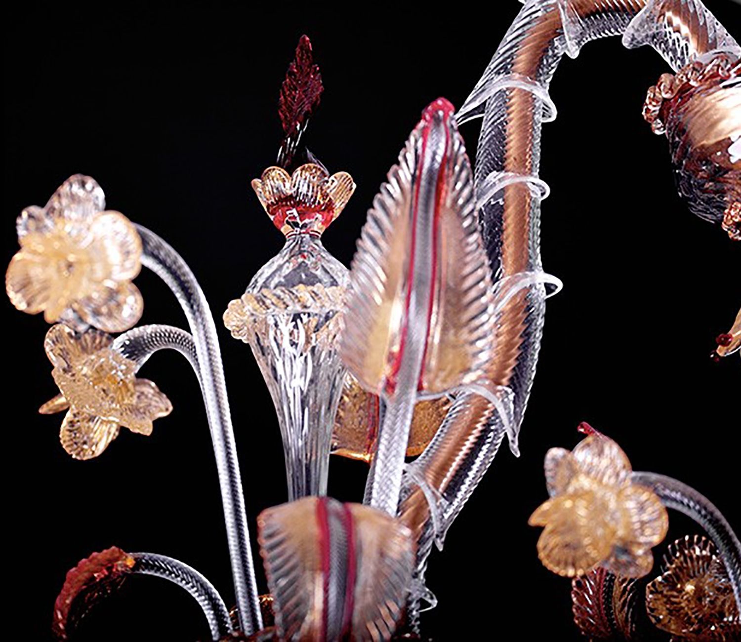 Caratterizzato dalla “Rigata Ritorta” dettaglio realizzato dai Maestri vetrai muranesi senza uso di stampi. Impreziosito da fiori e foglie, anche queste decorazioni lavorate rigorosamente a mano.