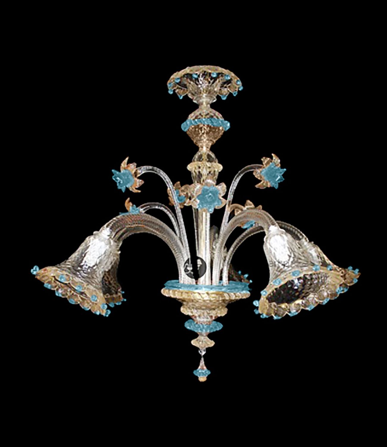 Inoltre, questo lampadario di murano, presenta altri elementi decorativi come il colore o l’oro 24k, che danno ulteriore evidenza della tecnica dei nostri maestri vetrai che si tramandano l’arte da padre in figlio da generazione.