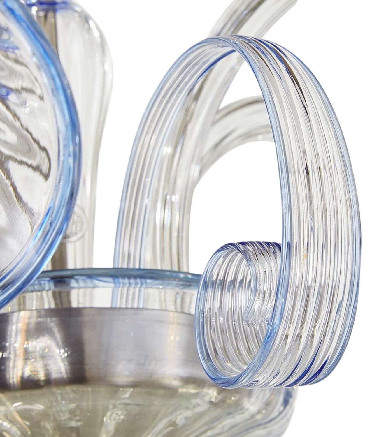 Caratterizzato da fiori a forma di "Pulcinella" che sono realizzate dai Maestri vetrai muranesi senza uso di stampi. Impreziosito da fiori e foglie, anche queste decorazioni lavorate rigorosamente a mano.